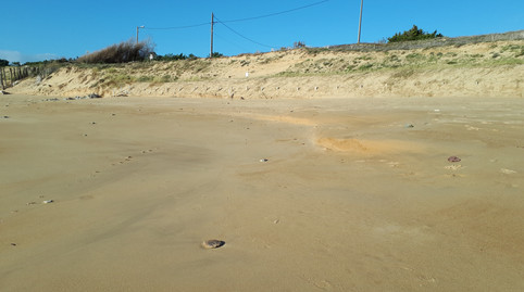Ce gros coefficient était accompagné d'une forte houle et d'un vent soutenu. Malgré une hauteur d'eau plus faible qu'en septembre, la mer est montée un peu plus haut...pour lécher les bas de dunes.