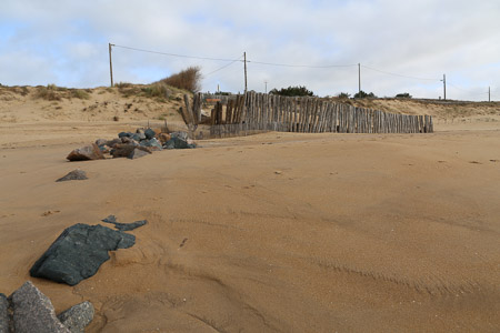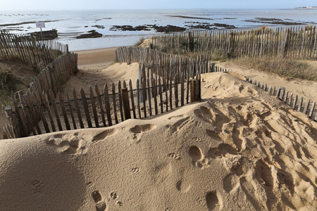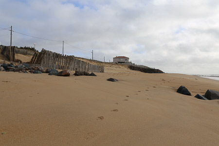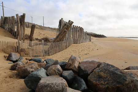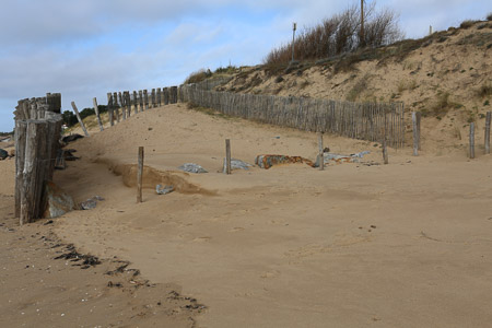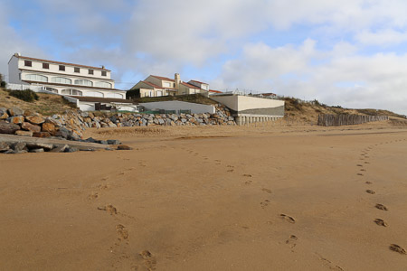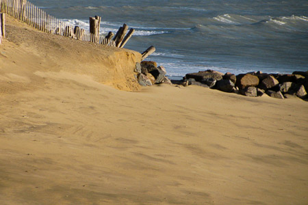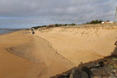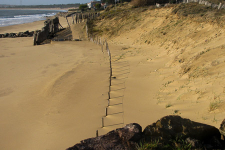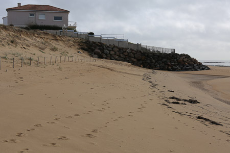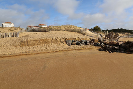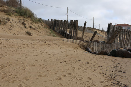 Les images ci-dessous ont été prises les 12 et 26 janvier 2016. On remarque les évolutions notables entre ces deux dates. En particulier, l'apport de sable très important (1,20m) au centre de la plage, recouvrant ainsi en partie l'épi rocheux devant la descente 37. On remarquera aussi la disparition de la vache au pied de la descente 38. Par ailleurs, les 2 dernières images montrent bien l'effet du vent sur la descente 37, bien assise sur son socle en dur, qui est ainsi depuis de nombreuses années, alors autant la réouvrir pour la saison prochaine !